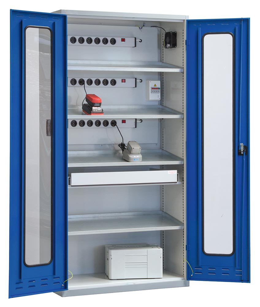 Akku-Schrank, BxTxH 1000x490x2000 mm, Türen mit Sichtfenstern, 1 Energieleiste, 9 Steckdosen, 1 Hauptschalter, RAL 7035/5010 EP517659