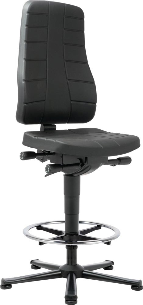 nach DIN 68877 · bedienungsfreundliche Gasfeder-Sitzhöhenverstellung · ergonomisch geformte Sitzfläche und Rückenlehne (extrahoch 600mm) · Synchronmechanik mit Gewichtsregulierung · Sitz in Neigung, Höhe und Tiefe verstellbar · Neigungs- und höhenverstellbare Rückenlehne · Sitz und Rückenlehne mit robustem Integralschaumpolster, beständig gegen leichte Säuren und Laugen, leicht abwaschbar · Untergestell mit abriebfesten Kunststoff-Bodengleitern und höhenverstellbarem Fußring für erhöhte Sitzposition