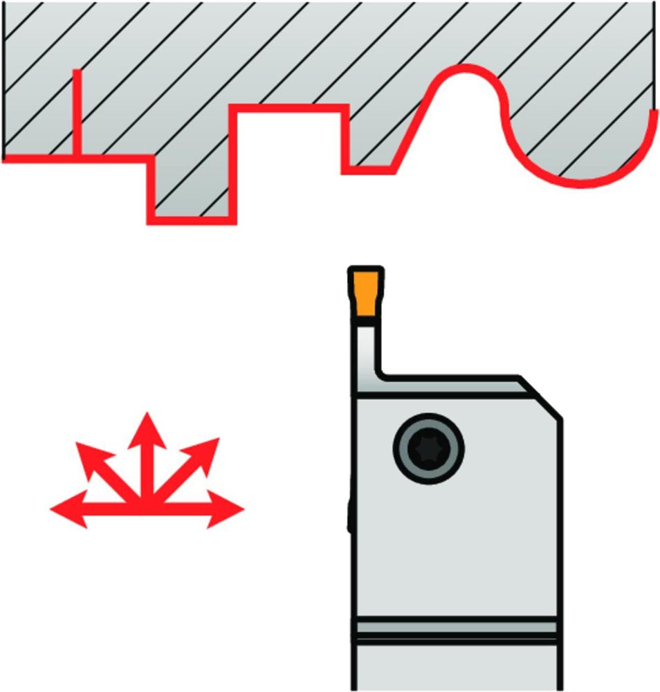 GL3-S3232MFR-20 ist ein rechter Außendrehhalter für GL Wendeschneidplatten. Am besten geeignet für das Längsdrehen und zum Profilieren aber auch zum Ein- und Abstechen.Körper für längere Standzeit oberflächenbehandelt.