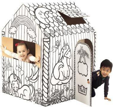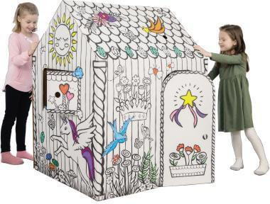 Dieses große · bemalbare Spielhaus fördert die Interaktion · die Fantasie und das gemeinsame Spiel der Kinder. Es ermöglicht stundenlanges · kinderfreundliches Spielvergnügen · da es aus robuster · langlebiger Wellpappe mit abgerundeten Kanten hergestellt ist. Dank des cleveren 2-teiligen Designs lässt es sich schnell und ohne Klebstoff zusammenbauen. Die Türen und Fenster des interaktiven Spielhauses mit dem lustigen Design lassen sich öffnen und schließen. Lassen Sie der Kreativität Ihres Kindes freien Lauf · indem es das vorgedruckte Design ausmalt (Stifte sind nicht im Lieferumfang enthalten).