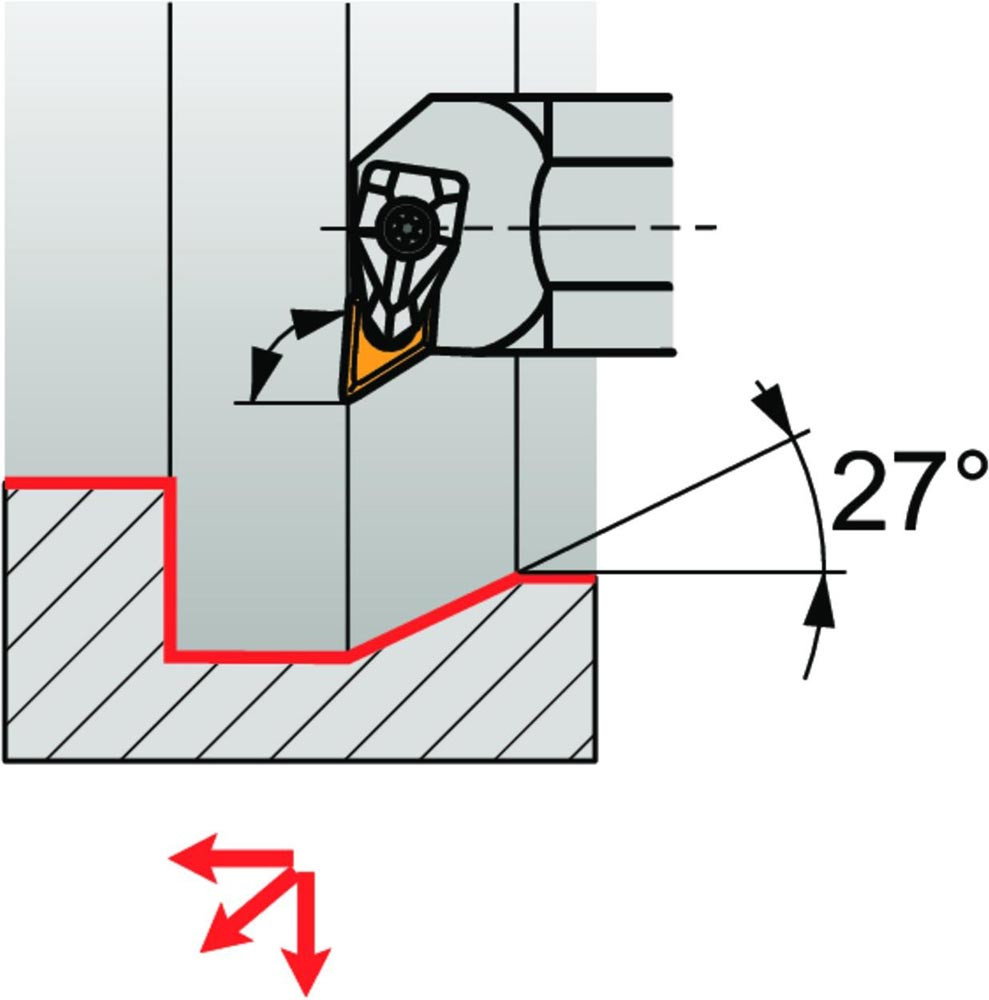 Dreh-Bohrstange doppelt geklemmt zum spannen von 55° Rhombus negative Wendeschneidplatten mit einem Innenkreisdurchmesser von 9.525mm · 4.76mm Dick (ISO Bezeichnung DN.. 1104.. ) · rechte Ausführung zum 93° Längsdrehen mit abgesetzem Schaft · Stahl mit Kühlkanalbohrung · 25mm Durchmesser x 300mm Länge für Innenentgraten · Innenkegeldrehen · Kopierdrehen in einer und mehreren Richtungen und Längsdrehen mit und ohne Schulter