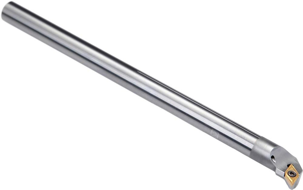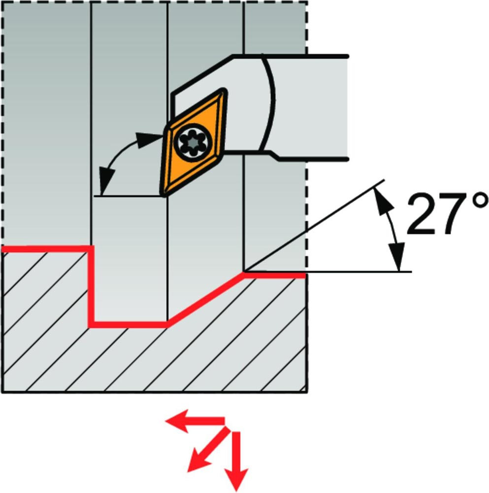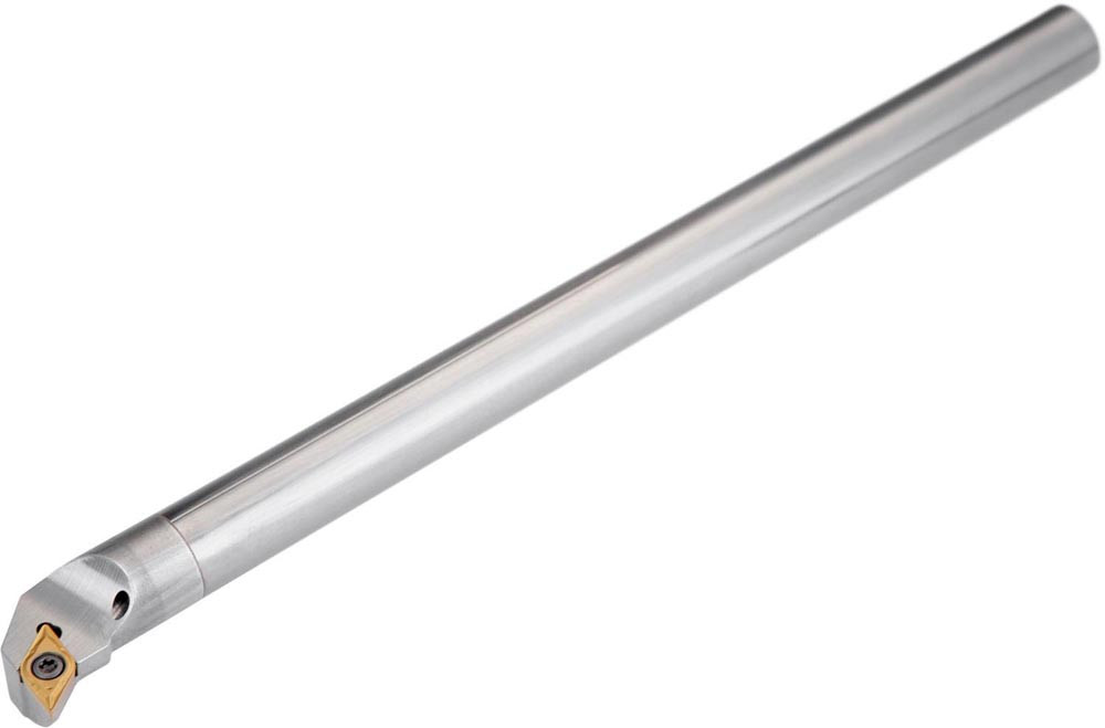 Dreh-Bohrstange mit Schraubklemmung zum spannen von 55° Rhombus positive Wendeschneidplatten mit einem Innenkreisdurchmesser von 6.35mm · 2.38mm Dick (ISO Bezeichnung DC.. 0702.. ) · rechte Ausführung zum 93° Längsdrehen mit abgesetzem Schaft · Hartmetall mit Kühlkanalbohrung · 12mm Durchmesser x 180mm Länge für Innenkegeldrehen · Kopierdrehen in einer und mehreren Richtungen und Längsdrehen mit und ohne Schulter