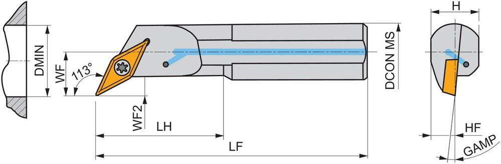 Dreh-Bohrstange mit Schraubklemmung zum spannen von 35° Rhombus positive Wendeschneidplatten mit einem Innenkreisdurchmesser von 3.97mm · 2.38mm Dick (ISO Bezeichnung VC.. 0702.. ) · rechte Ausführung für Sonderanwendungen · Hartmetall mit Kühlkanalbohrung · 16mm Durchmesser x 150mm Länge für Kopierdrehen in einer und mehreren Richtungen