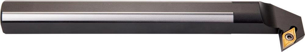 Dreh-Bohrstange mit Schraubklemmung zum spannen von 55° Rhombus positive Wendeschneidplatten mit einem Innenkreisdurchmesser von 9.525mm · 3.97mm Dick (ISO Bezeichnung DC.. 11T3.. ) · linke Ausführung zum Rückwärtsdrehen mit abgesetzem Schaft · Stahl ohne Kühlkanalbohrung · 20mm Durchmesser x 180mm Länge für Rückwärtsentgraten