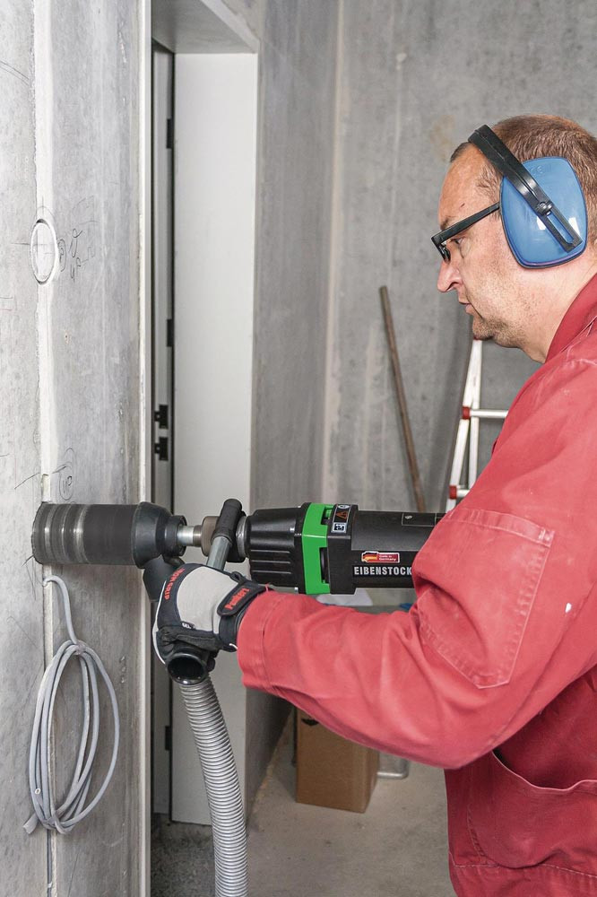 leistungsstarker Motor · Elektronik – Sanftanlauf, Überlastabschaltung · Getriebe mit zuschaltbarem Softschlag – hohe Arbeitsgeschwindigkeit · mechanische Sicherheitskupplung · Zusatzhandgriff – variabel am Spannhals verstellbar · Trockenbohren bis Ø 92 mm in besonders harte Materialien, z.B. hochverdichteten Kalksandstein, armierten Beton und anderen abrasiven Materialien mit hoher Arbeitsgeschwindigkeit · Herstellen von Wand- und Deckenöffnungen im Sanitär-, Heizungs- und Lüftungsbau · Dosensenken, z.B. für Schalter- und Abzweigdosen bei der Elektroinstallation