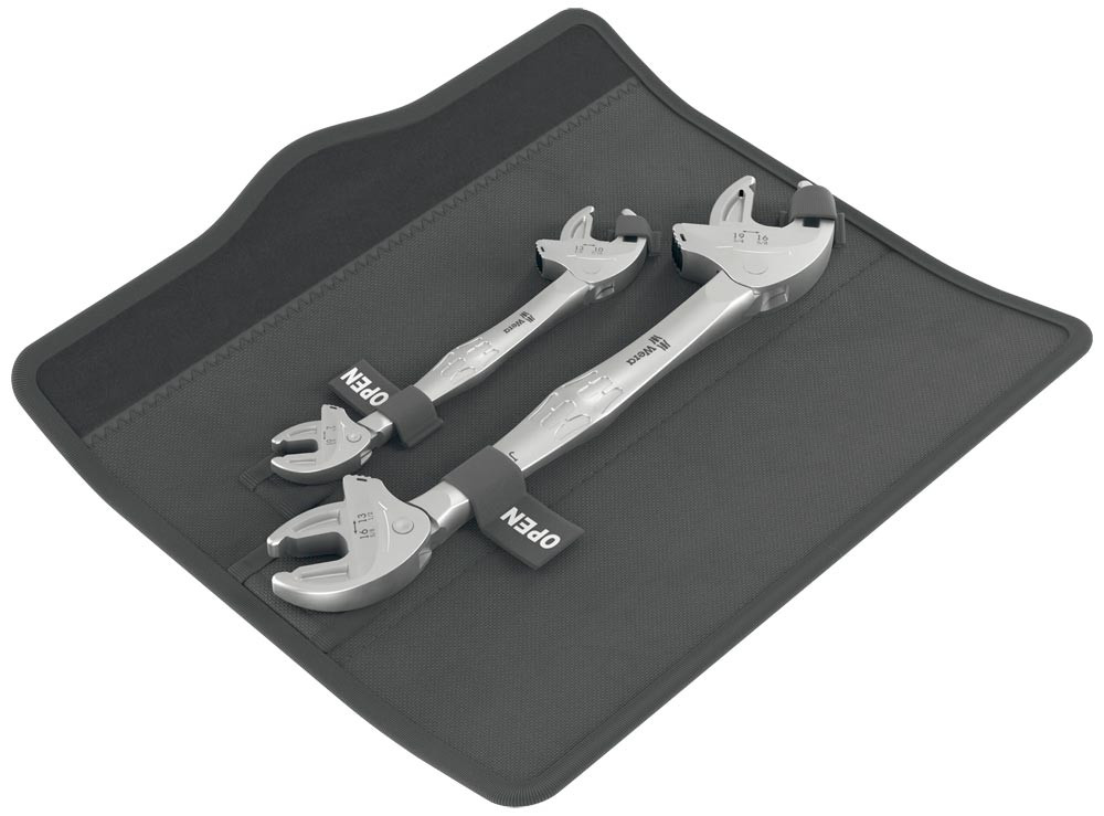 Selbstjustierende Doppelmaulschlüssel decken alle metrischen und zölligen Abmessungen im jeweiligen Anwendungsbereich ab ∙ Automatisches und stufenloses Greifen von Sechskant-Schrauben und Muttern ∙ Hebelmechanismus beim Greifen vermeidet Abrutschen und Beschädigungen ∙ Mechanische Ratschenfunktion für schnelles und durchgängiges Verschrauben ohne Absetzen des Schlüssels ∙ Rückschwenkwinkel von nur 30° durch Ansetzen in den Eckweitenprismen im Maul ∙ In robuster Falttasche mit Wera 2go Kompatibilität