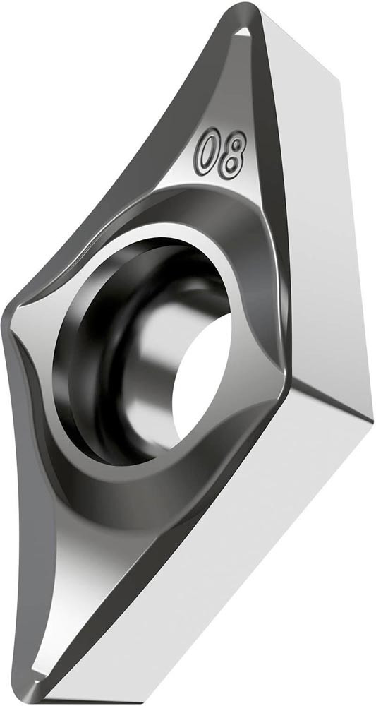 Einseitige positive Drehwendeschneidplatte · 55° Rhombisch mit 7° Freiwinkel · Innenkreisdurchmesser von 9.525mm · 3.97mm Dick · 0.2mm Radius · Indexgenauigkeit nach ISO-Toleranzklasse-G · Spanbrecher SF3 mit verrundeter Schneidkante · im Substrat H07 · unbeschichtet WC-Co Substrat in den ISO-Bereichen N10 -N30 und S01 -S20 · zum schlichten bis medium bearbeiten von Nichteisenmetallen und Superlegierungen
