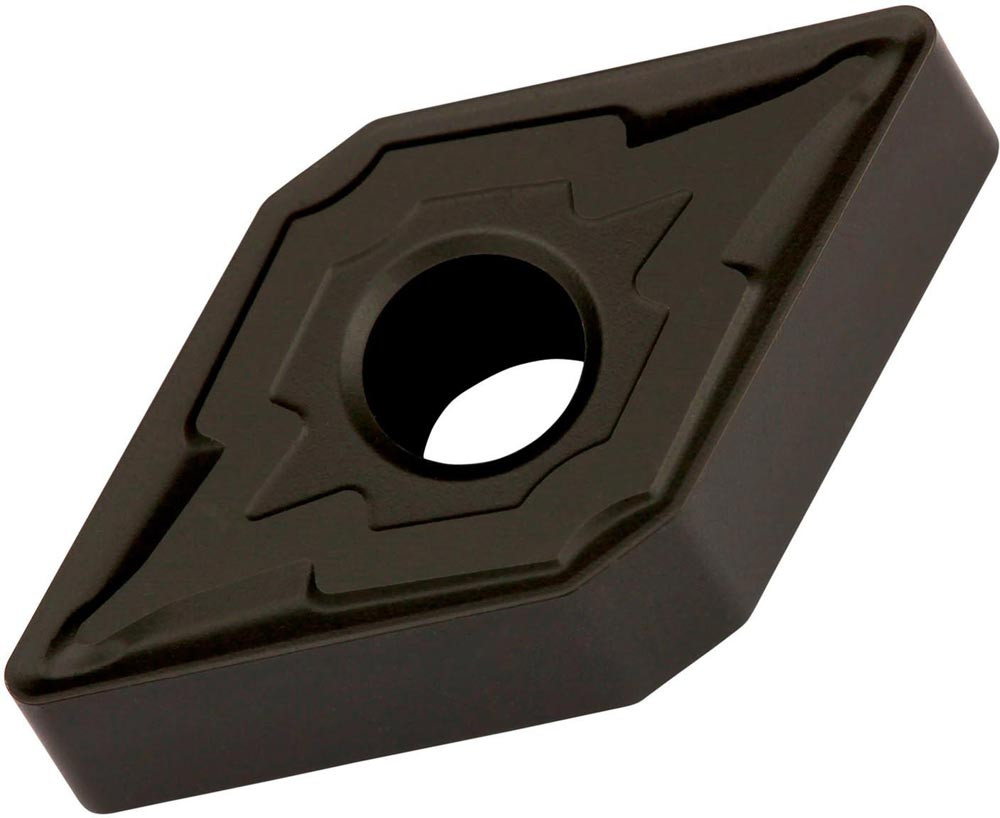 Doppelseitige negative Drehwendeschneidplatte · 55° Rhombisch mit Innenkreisdurchmesser von 12.7mm · 4.76mm Dick · 0.8mm Radius · Indexgenauigkeit nach ISO-Toleranzklasse-M · Spanbrecher M mit verrundeter Schneidkante · im Substrat T9335 · MT-CVD beschichtet functionally graded WC-Co carbide im ISO-Bereich P20 -P45 · zum schlichten bis schruppen bearbeiten von Stählen