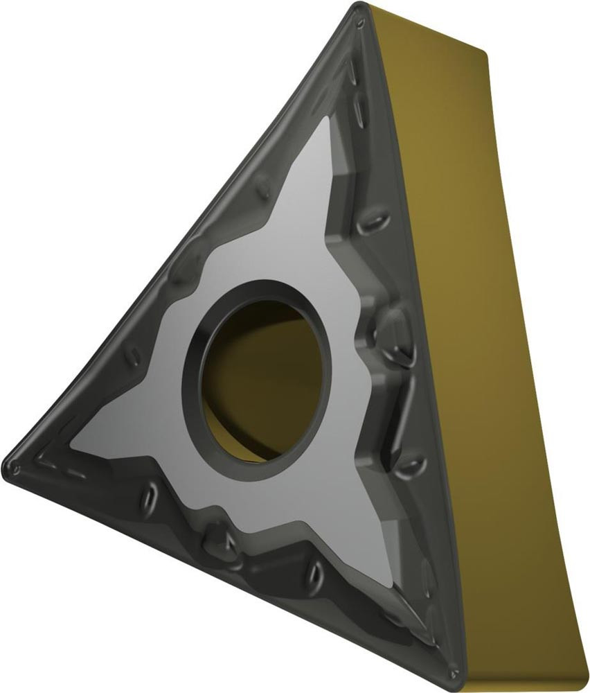 Doppelseitige negative Drehwendeschneidplatte · Triangular mit Innenkreisdurchmesser von 9.525mm · 4.76mm Dick · 0.4mm Radius · Indexgenauigkeit nach ISO-Toleranzklasse-M · Spanbrecher FM mit verrundeter Schneidkante · im Substrat T9415 · MT-CVD beschichtet WC-Co Substrat im ISO-Bereich P05 -P30 · zum schlichten bis medium bearbeiten von Stählen