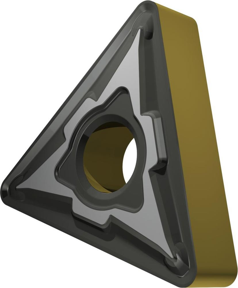 Doppelseitige negative Drehwendeschneidplatte · Triangular mit Innenkreisdurchmesser von 12.7mm · 4.76mm Dick · 1.2mm Radius · Indexgenauigkeit nach ISO-Toleranzklasse-M · Spanbrecher M mit verrundeter Schneidkante · im Substrat T9415 · MT-CVD beschichtet WC-Co Substrat im ISO-Bereich P05 -P30 · zum schlichten bis schruppen bearbeiten von Stählen