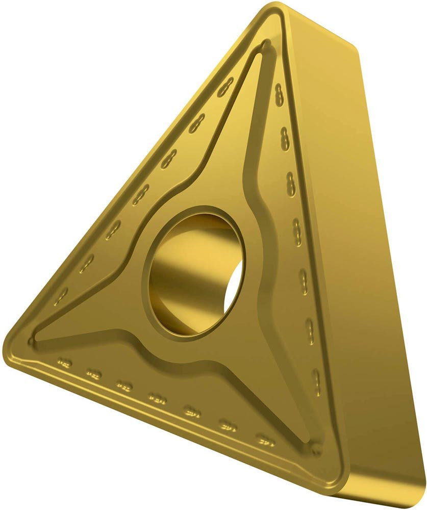 Doppelseitige negative Drehwendeschneidplatte · Triangular mit Innenkreisdurchmesser von 19.05mm · 9.52mm Dick · 2.4mm Radius · Indexgenauigkeit nach ISO-Toleranzklasse-M · Spanbrecher RM mit verrundeter Schneidkante · im Substrat T9226 · MT-CVD beschichtet funktionell abgestuftes WC-Co-Carbid in den ISO-Bereichen P15 -P35 und M10 -M30 · zum medium bis schruppen bearbeiten von Stählen und nichtrostenden Stählen