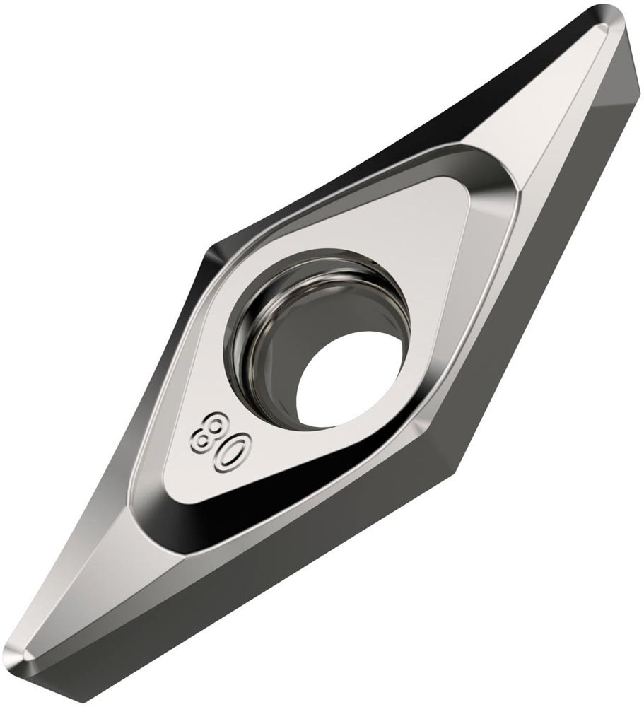 Einseitige positive Drehwendeschneidplatte · 35° Rhombisch mit 7° Freiwinkel · Innenkreisdurchmesser von 9.525mm · 4.76mm Dick · 0.4mm Radius · Indexgenauigkeit nach ISO-Toleranzklasse-G · Spanbrecher SF3 mit verrundeter Schneidkante · im Substrat H07 · unbeschichtet WC-Co Substrat in den ISO-Bereichen N10 -N30 und S01 -S20 · zum schlichten bis medium bearbeiten von Nichteisenmetallen und Superlegierungen