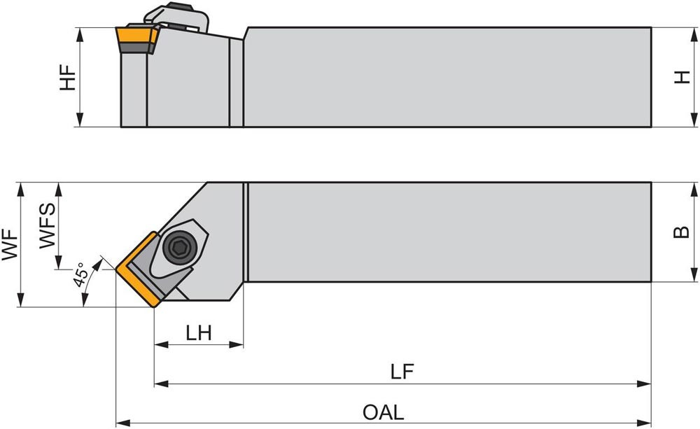 Dreh-Trägerwerkzeug von oben geklemmt zum spannen von Viereckig positive Wendeschneidplatten mit einem Innenkreisdurchmesser von 12.7mm · 3.18mm Dick (ISO Bezeichnung SP.. 1203... ) · rechte Ausführung zum 45° Stirndrehen mit abgesetzem Schaft · 25mm Werkzeughöhe x 25mm Breite x 150mm Länge für entgraten · Kegeldrehen · Kopierdrehen in einer und mehreren Richtungen · Stirndrehen ohne Schulter und Längsdrehen ohne Schulter