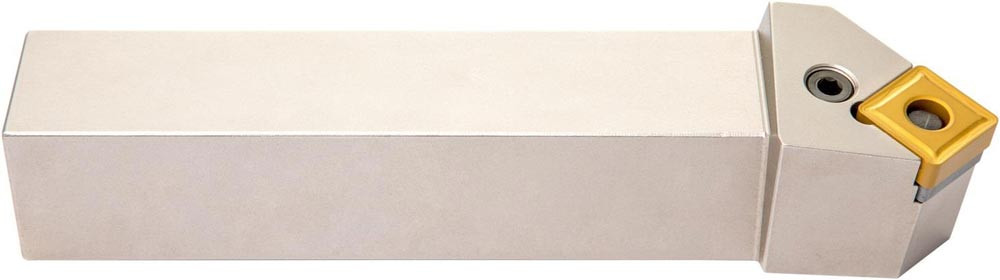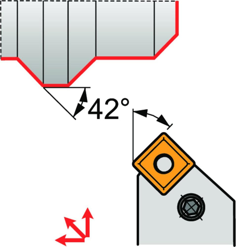 Dreh-Trägerwerkzeug mit Kniehebelklemmung zum spannen von Viereckig negative Wendeschneidplatten mit einem Innenkreisdurchmesser von 12.7mm · 4.76mm Dick (ISO Bezeichnung SN.. 1204.. ) · linke Ausführung zum 45° Stirndrehen mit abgesetzem Schaft · 25mm Werkzeughöhe x 25mm Breite x 150mm Länge für entgraten · Kegeldrehen · Kopierdrehen in einer und mehreren Richtungen · Stirndrehen ohne Schulter und Längsdrehen ohne Schulter
