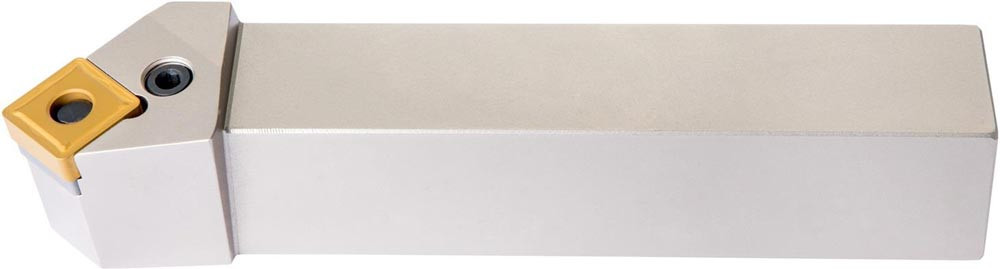 Dreh-Trägerwerkzeug mit Kniehebelklemmung zum spannen von Viereckig negative Wendeschneidplatten mit einem Innenkreisdurchmesser von 12.7mm · 4.76mm Dick (ISO Bezeichnung SN.. 1204.. ) · rechte Ausführung zum 45° Stirndrehen mit abgesetzem Schaft · 25mm Werkzeughöhe x 25mm Breite x 150mm Länge für entgraten · Kegeldrehen · Kopierdrehen in einer und mehreren Richtungen · Stirndrehen ohne Schulter und Längsdrehen ohne Schulter