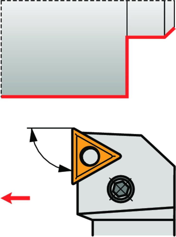Dreh-Trägerwerkzeug mit Kniehebelklemmung zum spannen von Triangular negative Wendeschneidplatten mit einem Innenkreisdurchmesser von 15.875mm · 6.35mm Dick (ISO Bezeichnung TN.. 2706.. ) · linke Ausführung zum 90° Stirndrehen mit abgesetzem Schaft · 40mm Werkzeughöhe x 40mm Breite x 250mm Länge für Kegeldrehen und Längsdrehen ohne Schulter