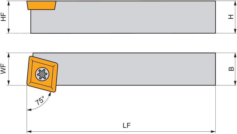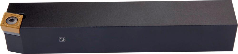 Dreh-Trägerwerkzeug mit Schraubklemmung zum spannen von 80° Rhombus positive Wendeschneidplatten mit einem Innenkreisdurchmesser von 12.7mm · 4.76mm Dick (ISO Bezeichnung CC.. 1204.. ) · rechte Ausführung zum 75° Stirndrehen mit Zylinderschaft · 25mm Werkzeughöhe x 25mm Breite x 150mm Länge für Kegeldrehen und Längsdrehen ohne Schulter