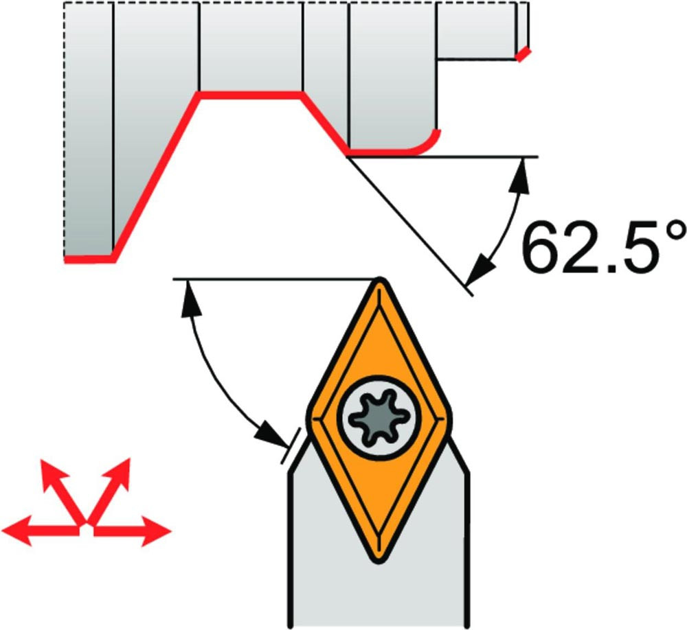 Dreh-Trägerwerkzeug mit Schraubklemmung zum spannen von 55° Rhombus positive Wendeschneidplatten mit einem Innenkreisdurchmesser von 6.35mm · 2.38mm Dick (ISO Bezeichnung DC.. 0702.. ) · neutrale Ausführung zum 62°30' Stirndrehen mit Zylinderschaft · 10mm Werkzeughöhe x 10mm Breite x 70mm Länge für entgraten · Kegeldrehen · Kopierdrehen in einer und mehreren Richtungen und Längsdrehen ohne Schulter