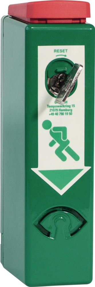 Der GfS EH-Türwächter® sichert den Notausgang und ermöglicht dessen Öffnung mit nur einem einzigen Handgriff.