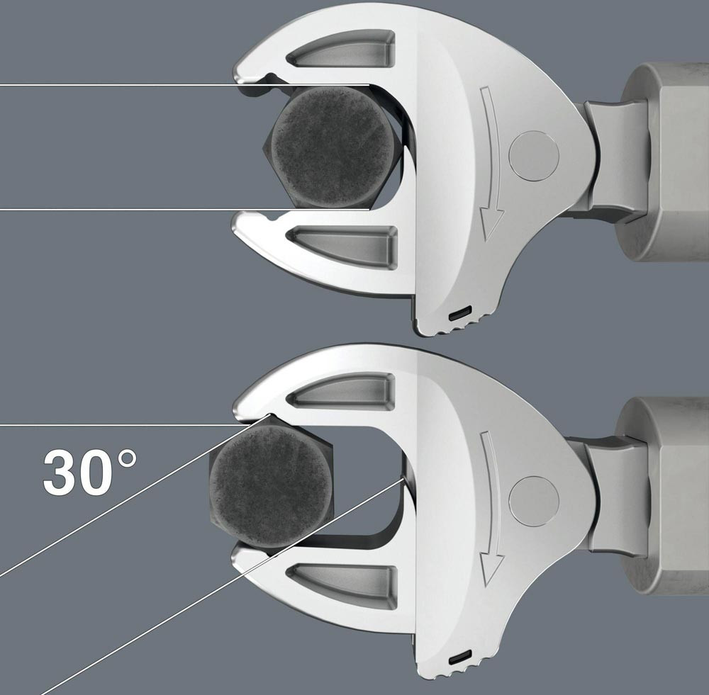 selbstjustierender Maulschlüssel mit Ratschenfunktion · für Drehmomentschlüssel der Serie Click-Torque X und XP mit 9x12 mm Aufnahme · größenverstellbare Maulseite · parallel geführte glatte Backen · mit 30° Rückschwenkwinkel über die Eckweitenprismen im Maul