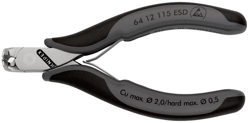 ESD · für feinste Schneidarbeiten z. B. in Elektronik und Feinmechanik · durchgestecktes Präzisionsgelenk · Schneiden zusätzlich induktiv gehärtet, Schneidenhärte ca. min. 56 HRC · Spezial-Werkzeugstahl in Sondergüte, geschmiedet, mehrstufig ölgehärtet · elektrisch ableitend - dissipativ