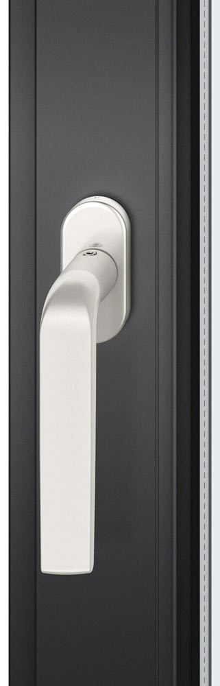 nach DIN EN 13126-3 · annähernd rechteckigen, leicht konisch verlaufenden Handhabe mit flacher Ansicht und leicht gewölbter Innenseite · Grifflänge ca. 135 mm · 4-Punkt-Kugelrastung zur sauberen spürbaren und hörbaren Positionierung des Fenstergriffs in 90 Grad Schritten · dauerhafter Gleichlauf · Befestigung unsichtbar · mit stabilisierenden Stütznocken, Durchmesser 10 mm, zum verschiebefreiem · Verschraubung M5 · Entfernung der Befestigungspunkte 43 mm · ovale Rosette · 7 mm Vollstift
