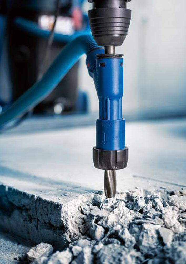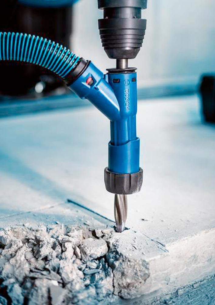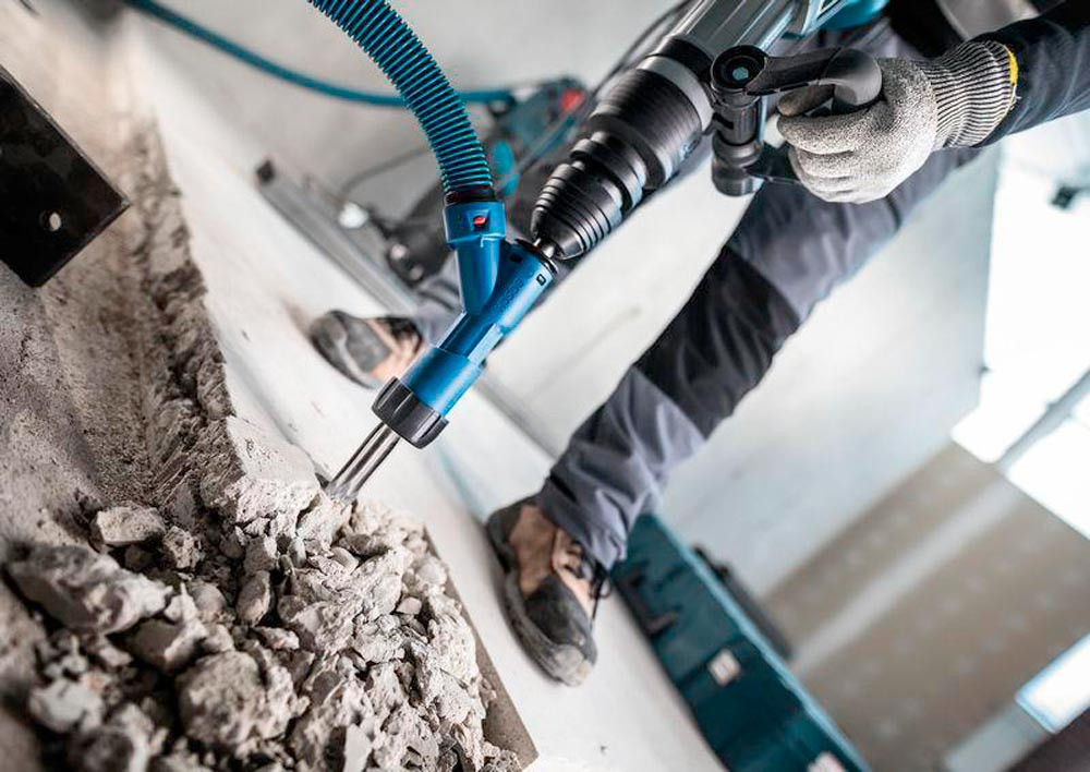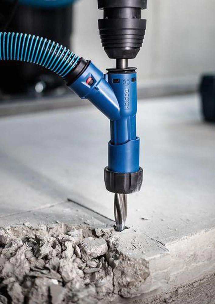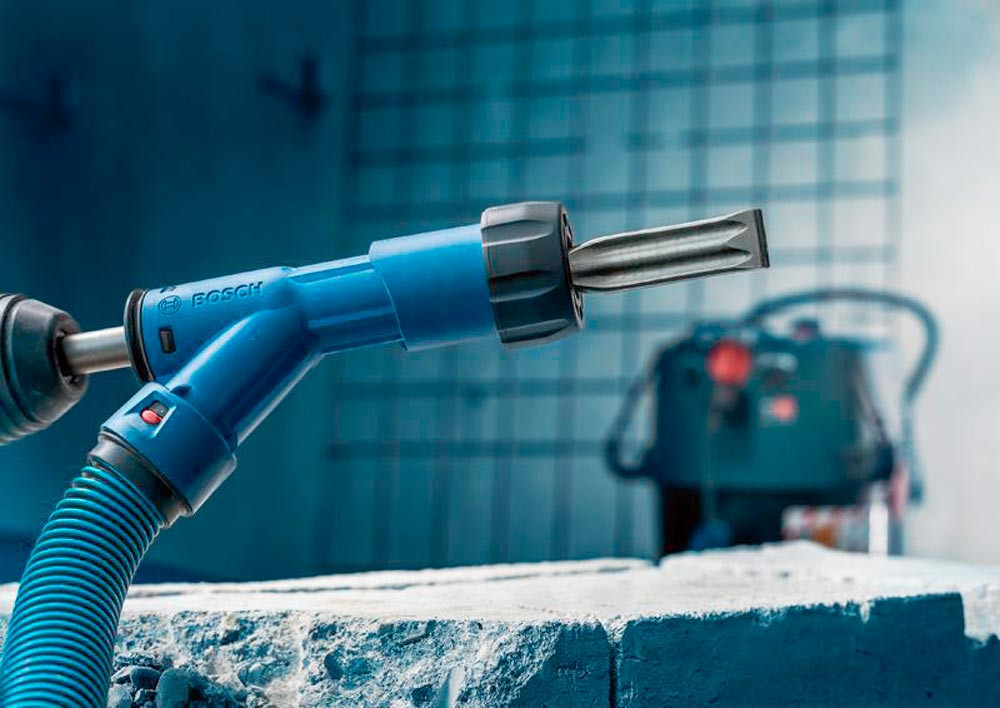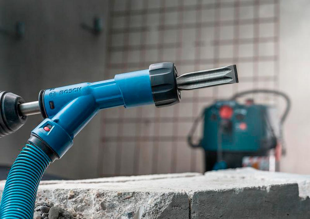 verbesserte Staubreduzierung beim Aufbrechen von Beton · das RTec-Element sorgt für einen höheren Materialabtrag · für Betonabbrucharbeiten wodurch viel Betonschutt entsteht und die Atemluft mit Staub belastet wird · mit EXPERT SDS Clean Set for Chiselling, damit die Umgebungsluft während der Arbeit möglichst sauber gehalten wird · Adapter kann mit dem RTec-Element für den Energiereflexionseffekt problemlos an selbstschärfenden Bosch SDS max Meißeln montiert und an einen Staubsauger angeschlossen werden · hocheffizienter Abtransport von Staub mit Bosch Particle Control