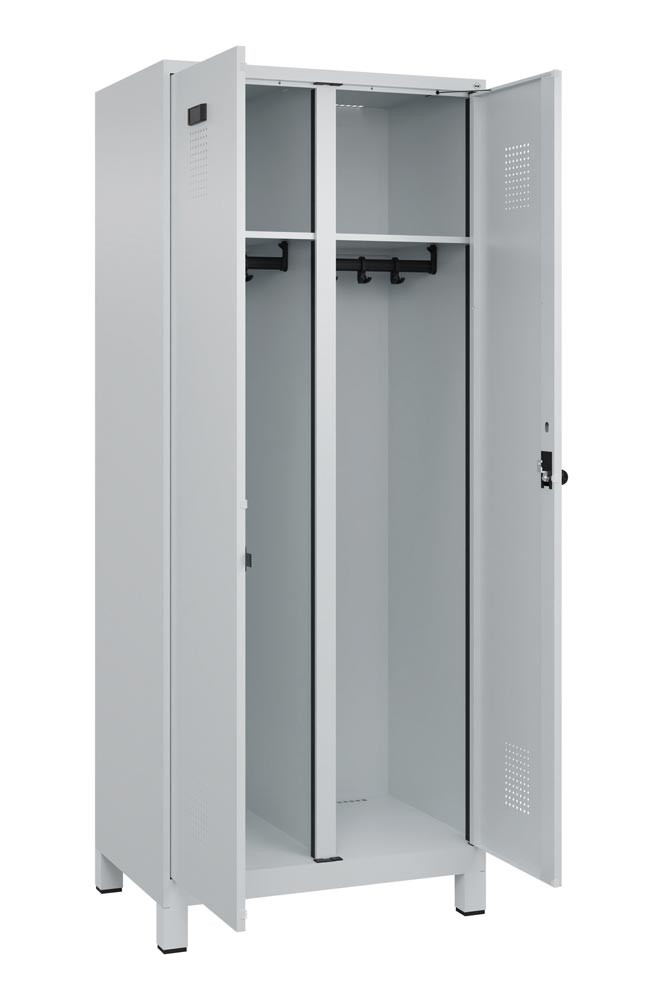 · Stabile Stahlkonstruktion mit hochwertiger Einbrennbeschichtung · Schmale Seitenkanten für verbesserte Optik bei Reihenstellung · Türen verstärkt, mit Anschlagdämpfer und Lüftungslochbild · Sicherheits-Drehriegelverschluss (serienmäßig) für Vorhangschloss (als Zubehör erhältlich) · Konstruktion aufbruchgeschützt gem. höchster Klasse C nach DIN 4547-2 · Abteilboden glatt auskehrbar · Verdrehsichere Doppel-Schiebehaken · Mit paarweise zueinanderschlagenden Türen und gemeinsamem Verschluss, 2 Abteile = 1 Person · Zur professionellen "Schwarz-/Weiß-Trennung" von Berufs- und Privatkleidung gem. Arbeitsstättenrichtlinie