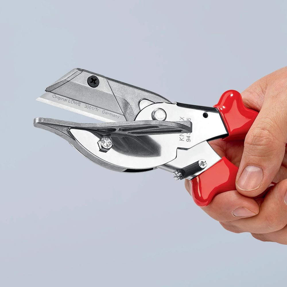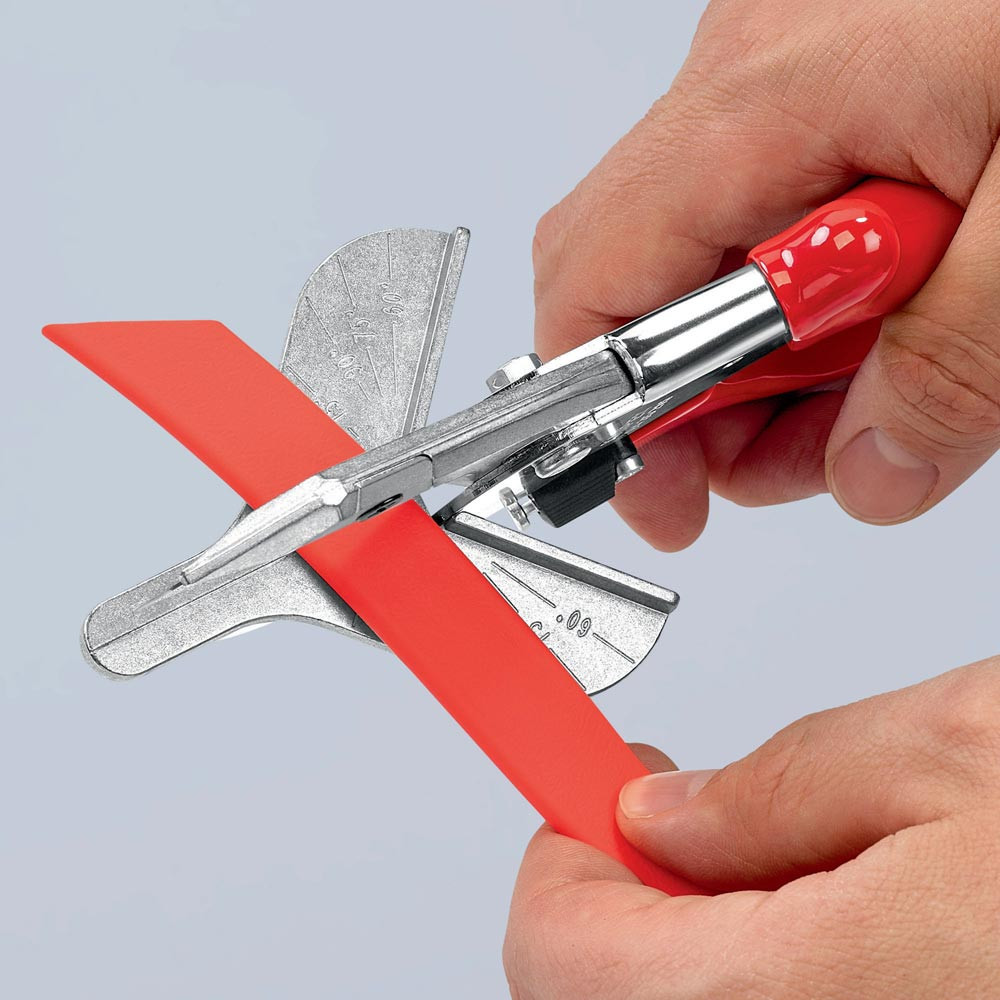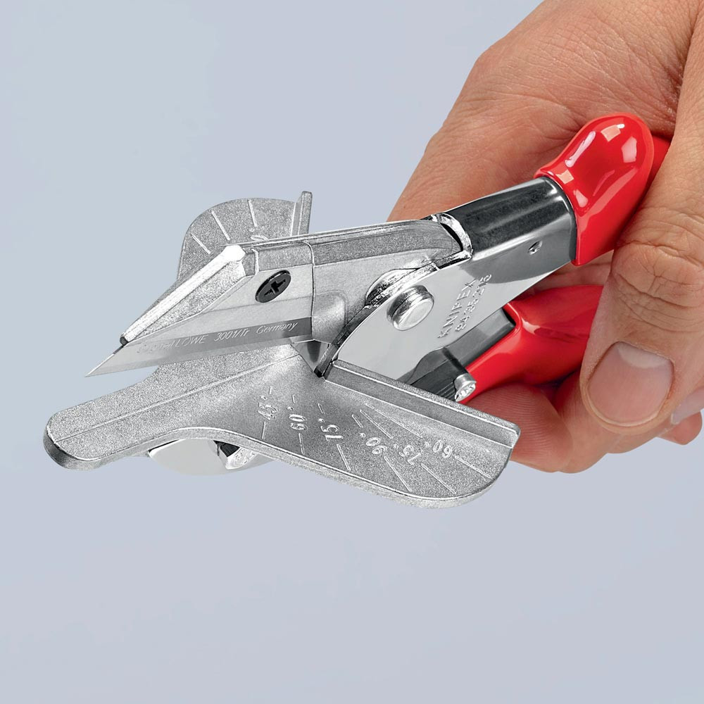 zum Schneiden von Kunststoff-, Gummi- und weichen Holzprofilen, auch für Flachbandkabel bis 56 mm Breite · auswechselbare Schneidauflage mit Anschlagwinkel für 45°-Schnitte und Markierungen für 60°-, 75°- und 90°-Schnitte · mit Öffnungsfeder und Sperrklinke · Werkzeugkörper: Spezial-Werkzeugstahl, gewalzt, ölgehärtet · Klinge: Standard-Trapezklinge, auswechselbar