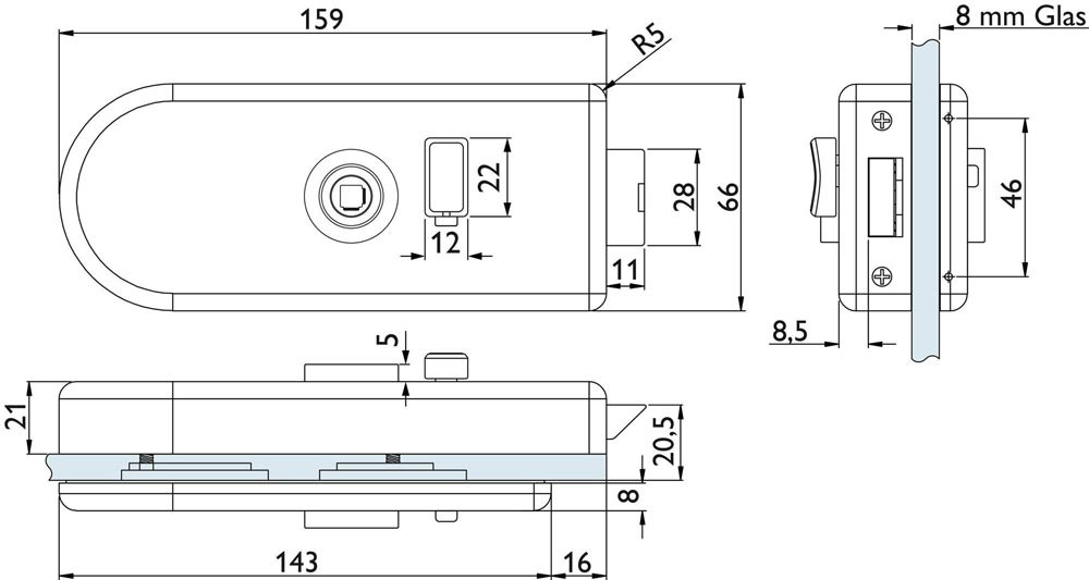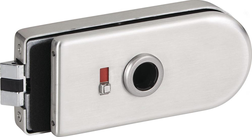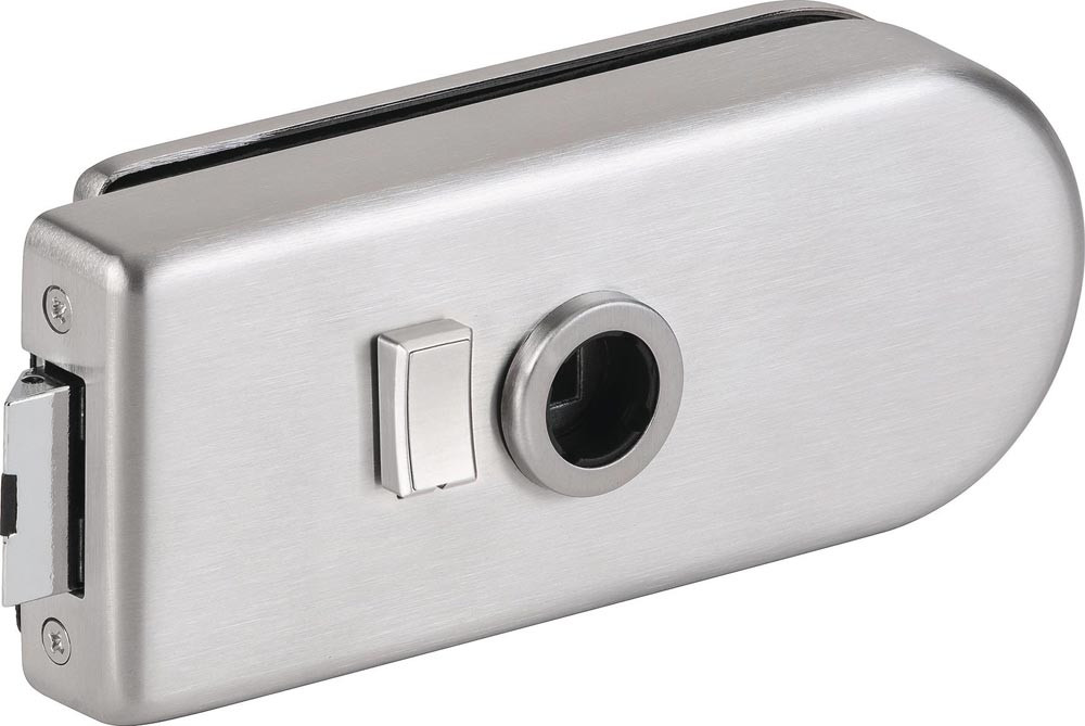 Klemm-Drückernuss · mit Flüsterfalle · manuelle Verriegelung · Drückerposition hinten · mit Drückerführung · abgerundete Form · aus Aluminium · Schlosskastenbreite: 66 mm · Schlosskastenlänge: 159 mm · Glasart: ESG · passend für Anschlagtüren · Lochung: WC Schauscheibe/Schlitzkopf · für 8 mm Glasstärke