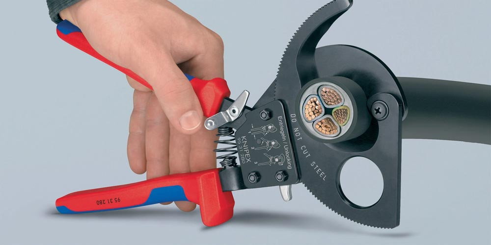 zum Schneiden von Cu- und Al-Kabeln · ein- und mehrdrähtig · nicht für Stahldraht und Drahtseile geeignet · Einhandbetätigung durch optimale Hebelübersetzung und Ratschenprinzip · einfache Handhabung · gehärtete Schneiden mit Präzisionsschliff · schneidet glatt und sauber ohne zu quetschen · Spezial-Werkzeugstahl in Sondergüte, geschmiedet, ölgehärtet