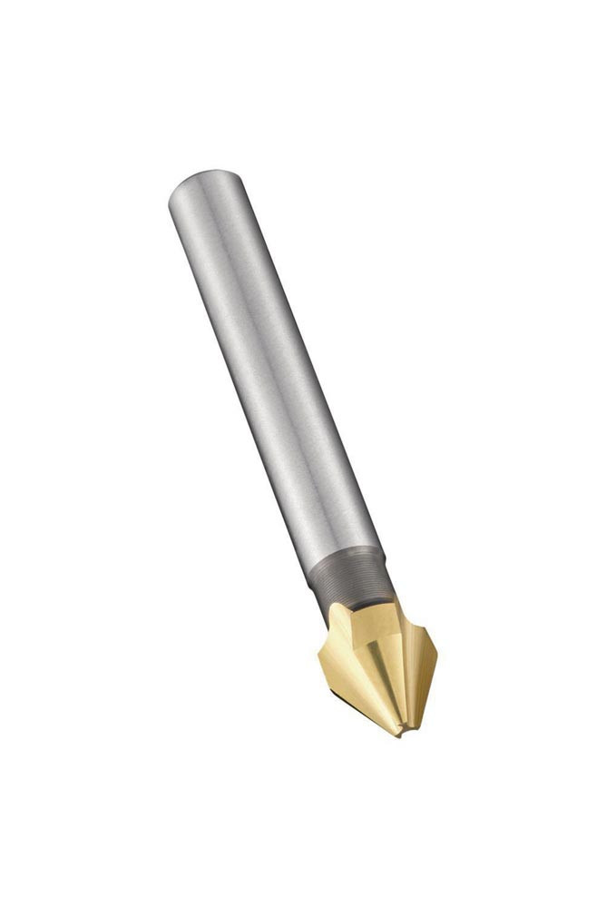 Kegelsenker mit 3-Schneiden · 60° Anfaswinkel · maximaler Durchmesser 12.50mm mit einer Gesamtlänge von 56mm und einer Kopflänge von 11.7mm und 8mm Zylinderschaft · gemäß DIN 334 C Standard zum Entgraten und Anfasen von Löchern mit einem minimalen Bohrdurchmesser von 3.20mm · HSS mit Standard TiN coating zum zerspanen von Stahl und Gusseisen · Grau · formbaren · dehnbaren und verdichteter Graphit Gusseisen · bearbeitetes und gegossenes Aluminium und Kupfer und Kupferlegierungen