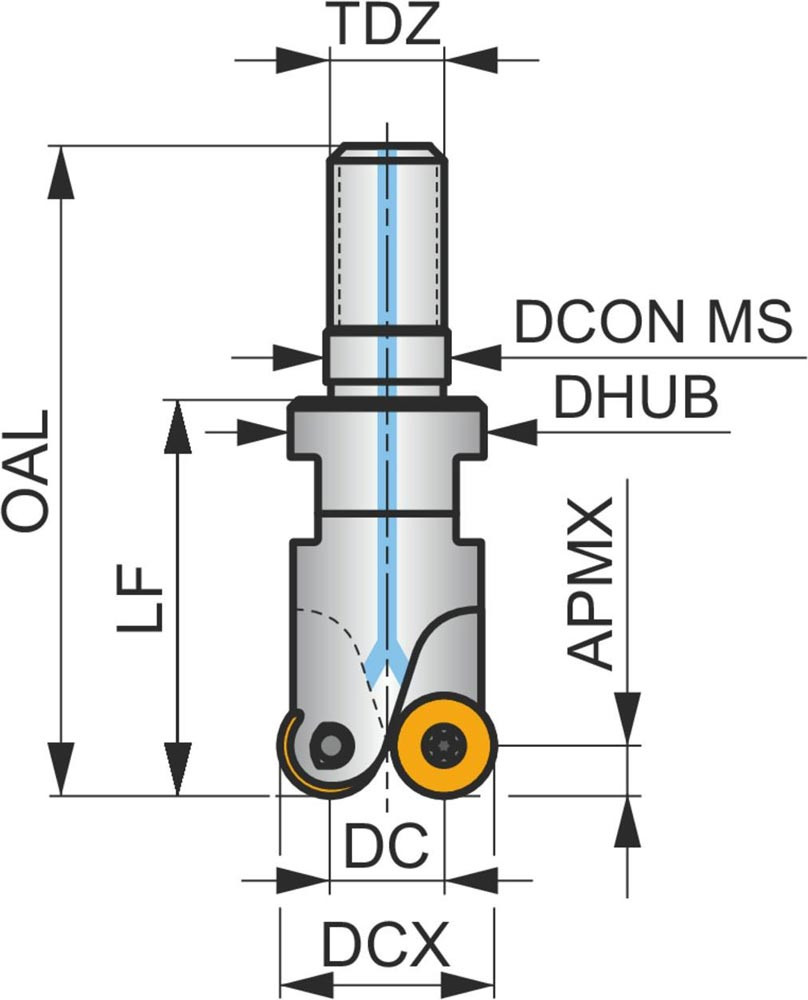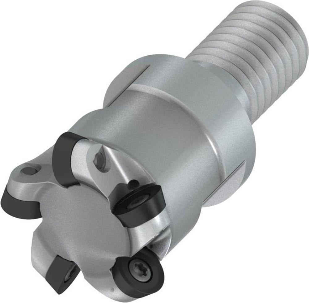 Plan-Kopierfräser mit doppelt negativer Geometrie welche 5 aus RD.. 0702MO.. oder RD.. 07T1MO.. einseitige Wendeschneidplatte · Schneiddurchmesser bis maximal 25mm mit M12 Gewindeschaft für standardisierte modulare Trägerwerkzeuge · 28mm funktional und 50mm Einsatzlänge · durchgehende Kühlung zum Planfräsen · Kopierfräsen · Rampen · progressiven Tauchfräsen und helikalen Fräsen mit einer maximalen Schnitttiefe von 2mm