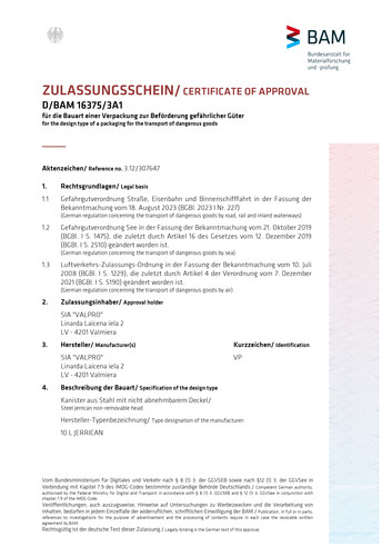 aus Stahlblech · mit Bajonettverschluss und Sicherung · für alle Kraftstoffarten geeignet · innen und außen kraftstoffbeständig lackiert · mit UN-Zulassung nach GGVSE und GGVSee · Alle Kraftstoff-Kanister (UN/RKK) müssen ab dem 01.06.2015 vom Endverbraucher nach GHS/CLP Verordnung gekennzeichnet werden. Zur Kennzeichnung dienen unsere Kanister-Haftetiketten Art.-Nr. 6024797