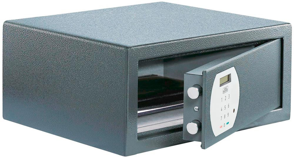 robuster einwandiger Korpus · Tür doppelwandig · verstärkte Riegelbolzen · Aufbohrschutz · für Wand- und Bodenbefestigung vorgerichtet (inkl. Befestigungsmaterial) · ideal für den Einbau in Schränke und andere Möbelstücke: Größe PS 130 mit Ordnertiefe · modernes, einfach programmierbares Elektronikschloss · Bequeme Handhabung durch motorgetriebene Verriegelung und automatische Türöffnung · verschiedene Öffnungsmethoden: Generalcode für den Hotelier · änderbarer Benutzercode für den Gast · verständliche Kurzanleitung für den Gast · haptisches Feedback bei Tastendruck · klares und gut lesbares Display · Batteriebetrieb mit 1,5 V Mignon (inklusive 4 Batterien)