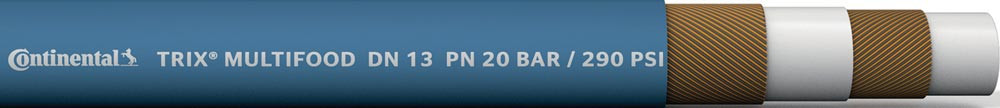 Kennzeichnung: „Continental ContiTech TRIX® MULTIFOOD DN 13 PN 20 BAR / 290 PSI Glas-/Gabel-Symbol FDA Made in Germany" auf weißem oder blauem Untergrund