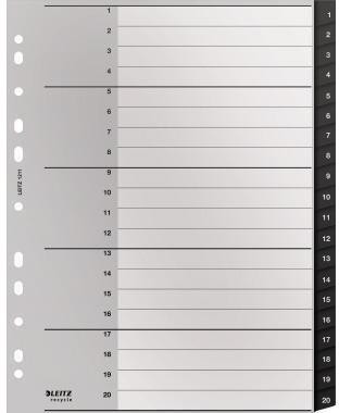 Umweltfreundliches Register in Premiumqualität mit numerischem Aufdruck. Hilft bei der übersichtlichen Organisation von Dokumenten oder Unterlagen für den Heim- · Schul- oder Bürogebrauch. Mit der neuen umweltfreundlichen Recycle Serie von Leitz helfen Sie · unsere Umwelt zu schützen und sorgen gleichzeitig für ein attraktives und umweltfreundliches Erscheinungsbild Ihres Büros.