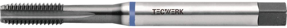 HSS-Co · Form B · Typ VA · TiCN-beschichtet · Blauring · geradegenutet · Flanken hinterschliffen · metrisches ISO-Gewinde · DIN 13 Blatt 1 · Toleranzfeld ISO2 (6H) · mit Schälanschnitt für Durchgangsgewinde · für rost-, säure- und hitzebeständige Stähle bis 1000 N/mm² Festigkeit