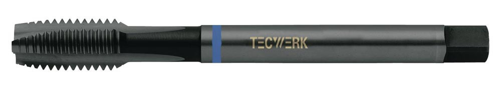 HSS-Co · Form B · Typ VA · nitriert und vaporisiert · Blauring · geradegenutet · Flanken hinterschliffen · metrisches ISO-Gewinde · DIN 13 Blatt 1 · Toleranzfeld ISO2 (6H) · mit Schälanschnitt für Durchgangsgewinde · für rost-, säure- und hitzebeständige Stähle >850 N/mm² Festigkeit