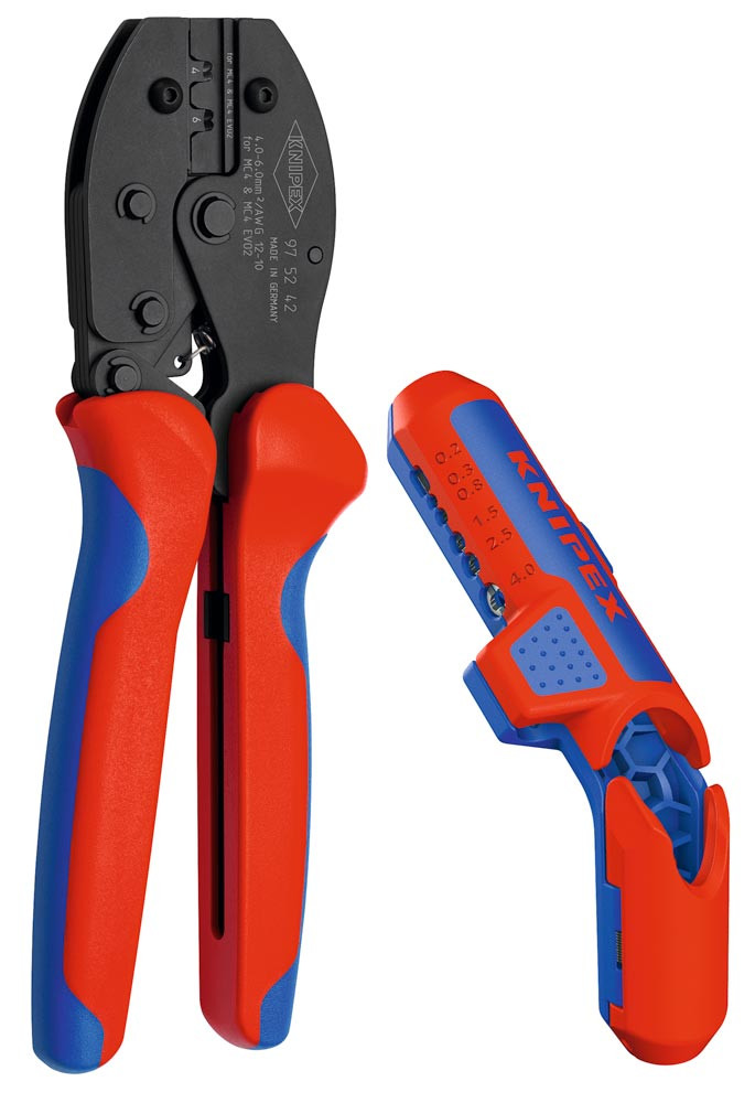Für Installation und Wartung von PV-Anlagen ∙ KNIPEX ErgoStrip® PV zum schnellen und präzisen Abisolieren von Solarkabeln mit 4 und 6 mm² und zum Abmanteln und Abisolieren aller gängigen Rund- und Feuchtraumkabel ∙ KNIPEX PreciForce® verpresst PV-Leiter (4 und 6 mm²) mit MC4®- und MC4® EVO 2-Verbindern