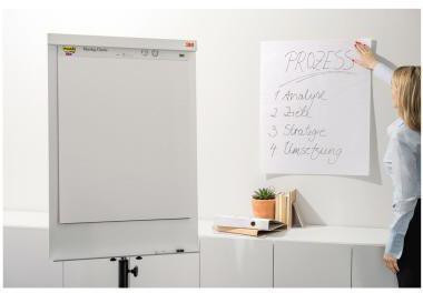 Rückseitig beschichtet mit Post-it® Haftkleber · haftet auf nahezu allen Wandflächen · kein Durchschreiben auf den Untergrund und ohne Ständer verwendbar. Mit Tragegriff für den leichten Transport.