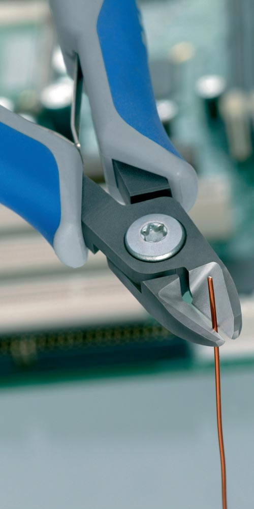 für feinste Schneidarbeiten z. B. in Elektronik und Feinmechanik · geschliffene, scharfe Schneiden · Schneiden zusätzlich induktiv gehärtet, Schneidenhärte ca. min. 64 HRC · ca. 20% weniger Gewicht · geschraubtes Gelenk · Öffnungsfeder · Chrom-Vanadin-Kugellagerstahl, geschmiedet, mehrstufig ölgehärtet