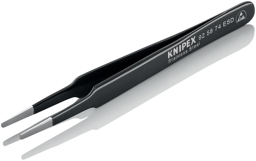 ESD-Beschichtung: blendfrei schwarz, mit einem Oberflächenwiderstand von ca. 105 Ohm · Spitzen blendfrei gebürstet · Greifflächen mattiert für optimalen Halt · Chrom-Nickel-Stahl, rostfrei, antimagnetisch (18/10)