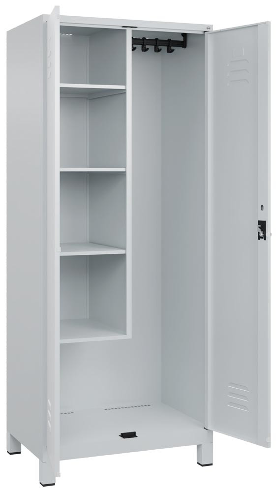 Putzmittelschrank Premium, BxTxH 800x500x1950 mm, 2 Abteile a 400 mm, mit Füßen, Drehriegel, RAL 7035