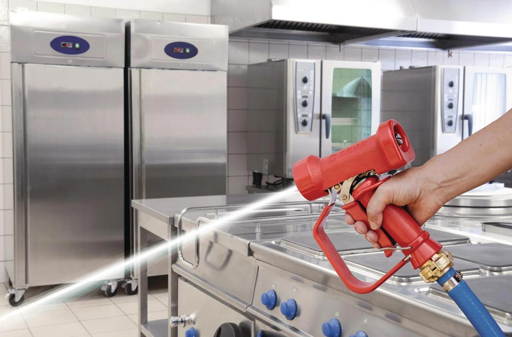 für Reinigungszwecke bei andauernden Heißwasseranwendungen in Industrie, Gewerbe, Werkstatt und Lebensmittelindustrie · verstärkter Sicherheitsbügel · rote Gummiummantelung dient zum Schutz gegen Beschädigungen, sowie Kälte- und Wärmeweiterleitung des durchfließenden Wassers · stufenlose Regulierung der Strahlstärke, leichte Handhabung durch Einhandbetrieb, arretierbar · Strahlform mittels Münze einstellbar · wasserführende Metallteile aus Edelstahl 1.4401 · Gummiummantelung aus EPDM · Betriebsdruck max. 24 bar · Temperatureinsatzbereich max. 95 °C · Reinigungspistole ist nicht für Dampf geeignet! · Dichtung: FKM (Fluorkautschuk) nach DIN ISO 1629, Teflon/Luft isoliert