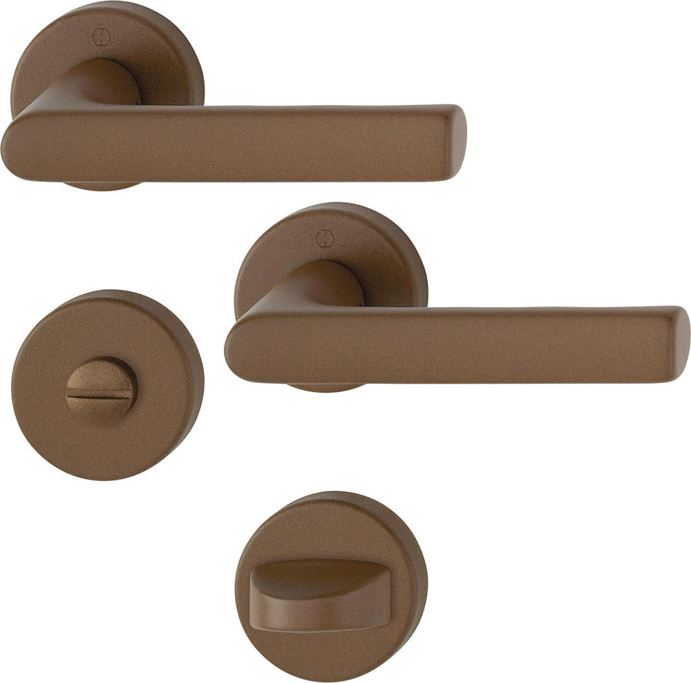 HOPPE-SchnellstiftPlus-Aluminium-Rosetten-Türgriff-Garnitur mit Schlitzkopf/Olive für Bad/WC-Türen, geprüft nach DIN EN 1906: 37-0140A, Objekt-Garnitur Lagerung: Türgriffe lose, Rückholfedern rechts/links verwendbar, wartungsfreie Gleitlager
