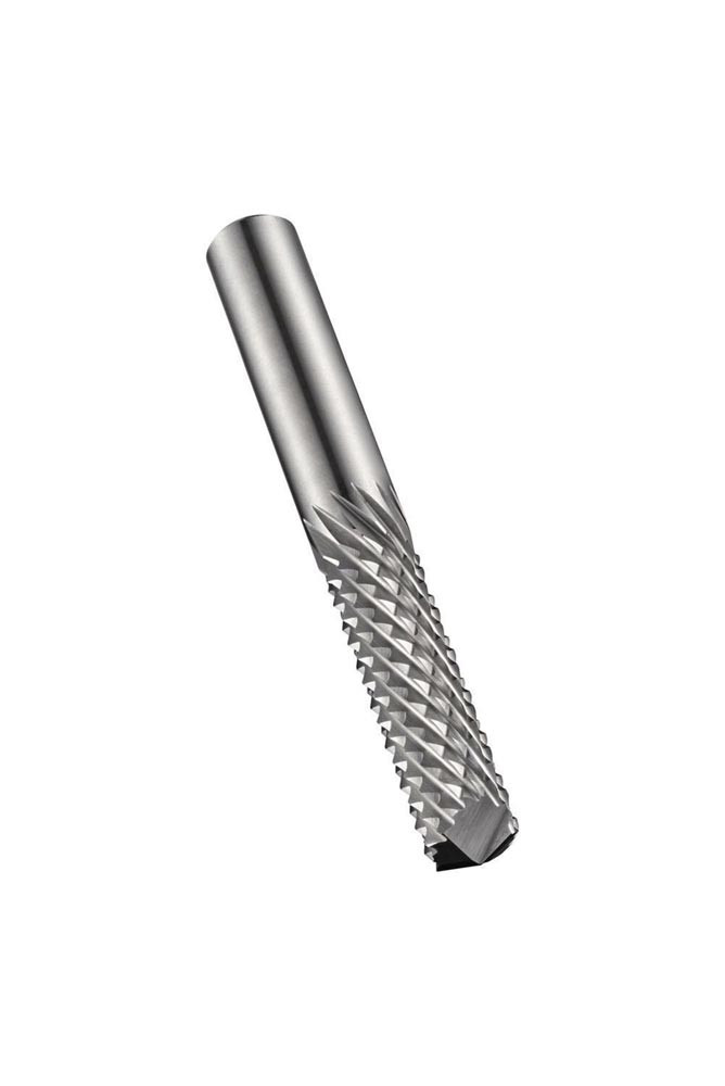 Router mit 135° Bohrspitze · Durchmesser 6mm mit 19mm Schnittlänge · 63mm Gesamtlänge und 6mm Schaft · Vollhartmetall mit blanker Oberfläche · GRP diamantform Schnitt mit mittlerer Zahnteilung zum Konturieren · Ausschneiden von Formen und Löchern in Polymere
