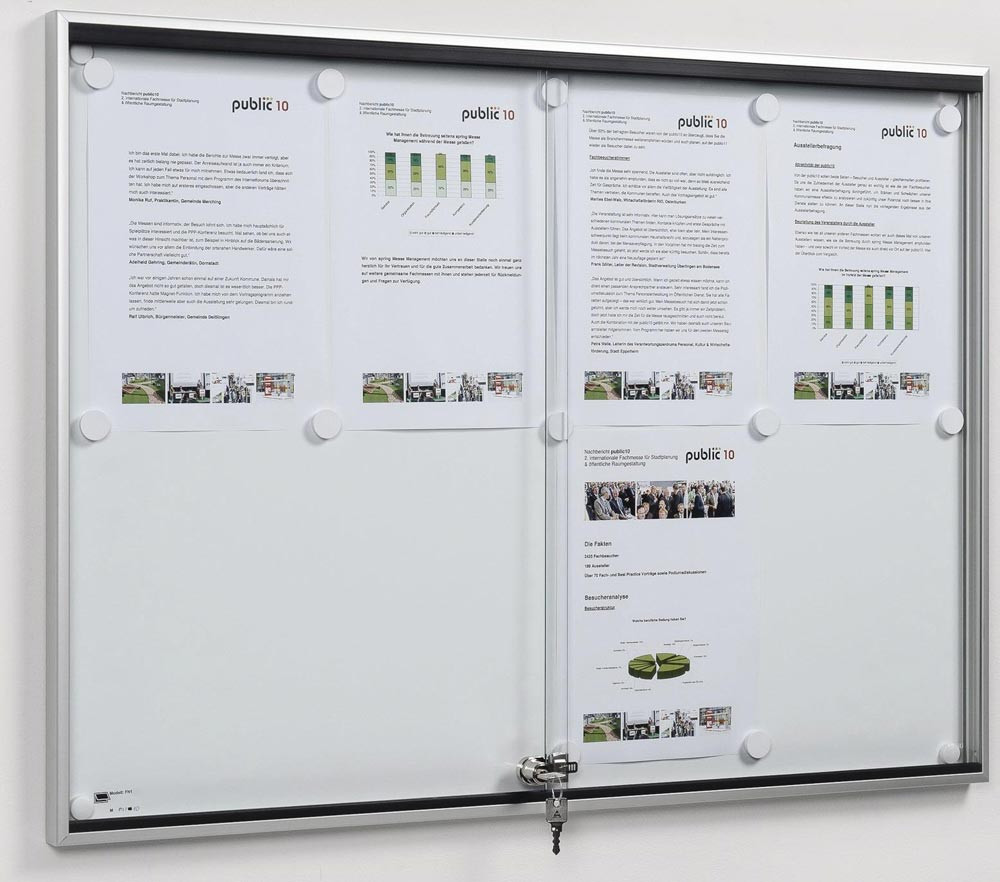 Schaukästen für den Innen- und Außenbereich · Aluminiumkonstruktion, silberfarbig eloxiert · mit abgerundetem Profil · zur Wandmontage · magnethaftende, weiße Rückwand (inkl. 4 Magneten) · Bautiefe 30 mm · Schiebetüren in schwarzen Kunststoff-Laufschienen, aus ESG-Sicherheitsglas · Glas-Schiebesperrschloss mit 2 Schlüsseln