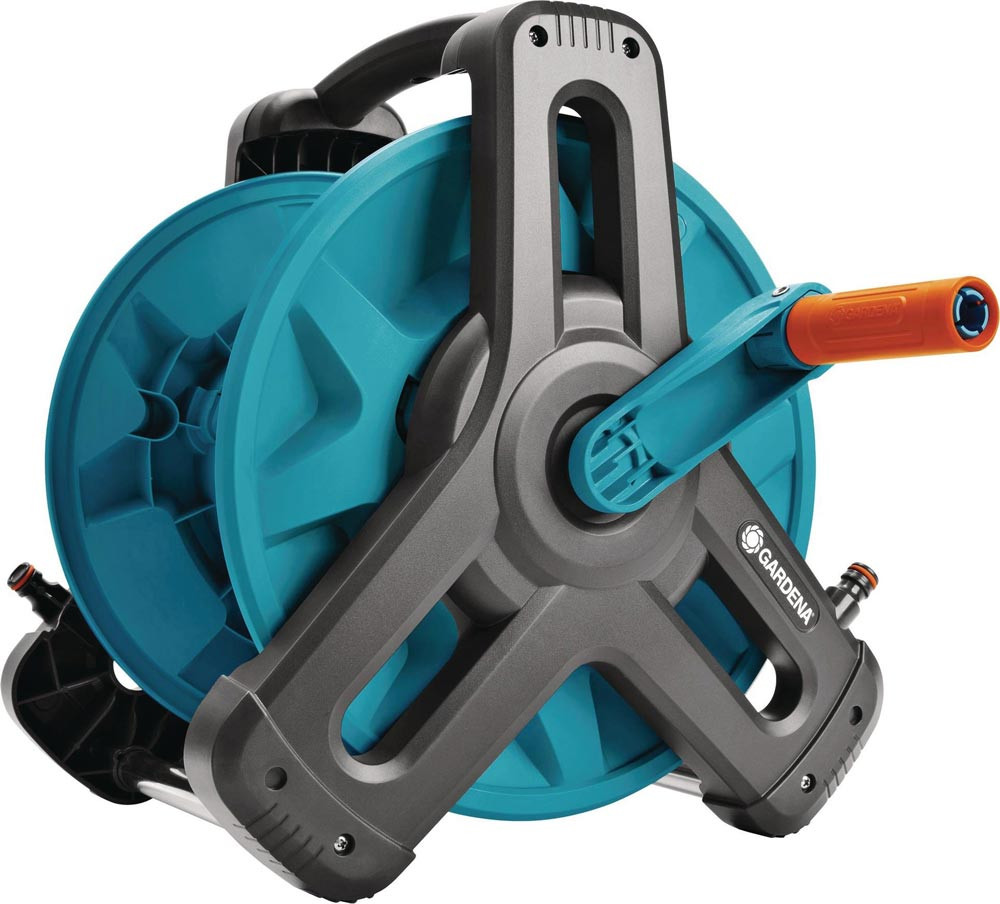 Aufrollen ohne Verknicken oder Knoten mittels freilaufender, einklappbarer Handkurbel · platzsparende, kompakte Bauweise · hohe Standfestigkeit · integrierter ergonomischen Tragegriff: handlich und angenehm zu transportieren · integrierter Nachtropfstopp · abgewinkelter Schlauchanschluss im Innenteil der Schlauchtrommel