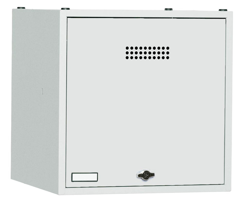 Schließfachwürfel, BxTxH 500x500x500 mm, Tür glatt, Lochrosetten und Etikettenrahmen, Fachboden, Drehriegel, RAL 7035 EP520459